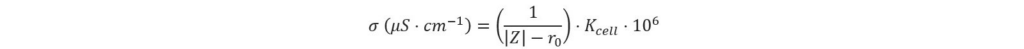 Una vez finalizado el ensayo EIS, |Z |se extrae de los datos de impedancia. Utilizando ese valor, ro y Kcelúla (que se dan en el recuadro SPE), junto con la ecuación que se muestra en Figura 1Las diferentes conductividades se pueden calcular en µS·cm.-1.