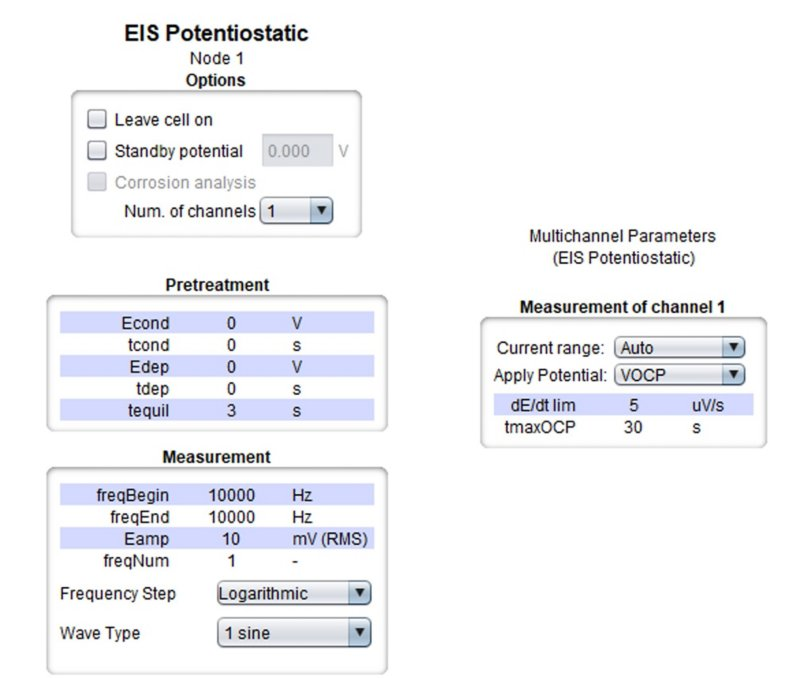 La configuración del software utilizada en este estudio se muestra en Figura 4. Observe que tanto freqBegin como freqEnd tienen el mismo valor (10 kHz), ya que solo el |Z Se necesita un valor a esta frecuencia. Además, el experimento se lleva a cabo al valor del potencial de circuito abierto (OCP).