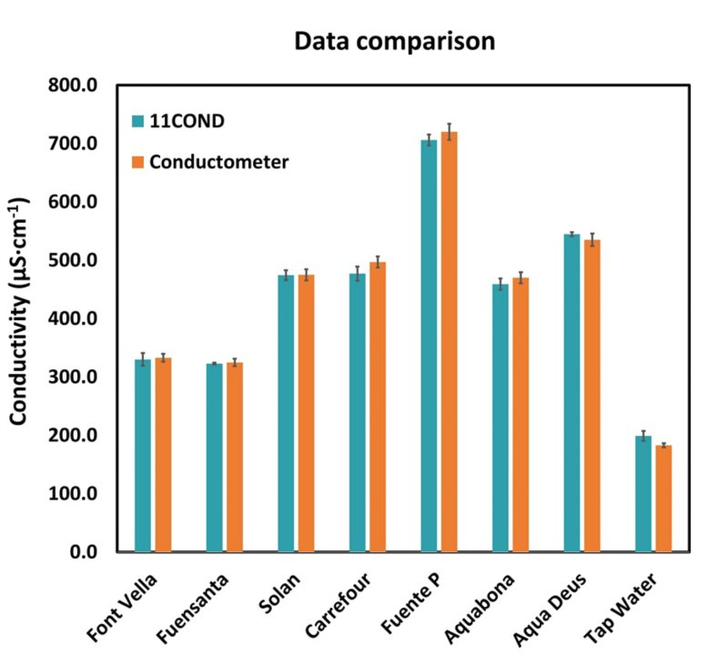 Figura 5 Muestra los resultados de este estudio junto con las barras de error asociadas para cada tipo de muestra. Los valores obtenidos con el electrodo 11COND y la sonda de conductividad estándar son muy similares, lo que demuestra la idoneidad del uso del SPE. Cada muestra de agua se analizó con tres SPE diferentes para garantizar la reproducibilidad de los resultados.
